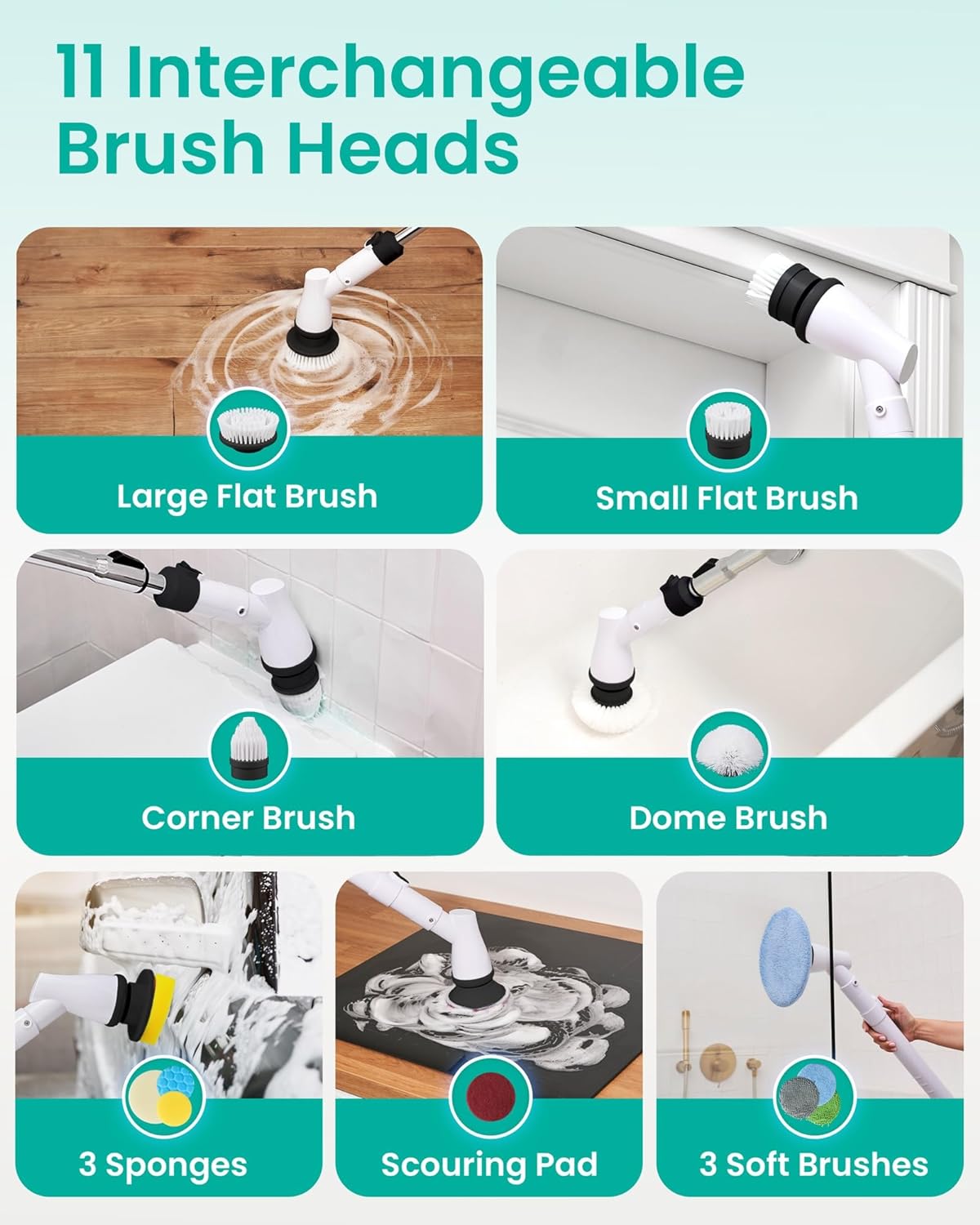 11 Replacement Brushes - 11 interchangeable brush heads can be used on a variety of surfaces such as showers, hard to reach areas, glass, tile, kitchens, wheels and windows.
